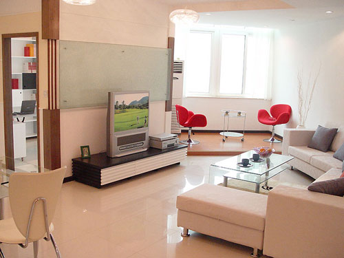 在空間功能分割上,電視背景墻把書房和客廳區分開來,通過鋪裝不同顏色和材質的瓷磚及地板,客廳、衛生間和餐廳三個功能區也得到區分,和原來相比,功能分區不但清晰,而且十分有序。需要提醒注意的是,餐區和客廳的分割線,也就是瓷磚和地板的結合線一定要和客廳斜邊垂直,化不規整為規整。